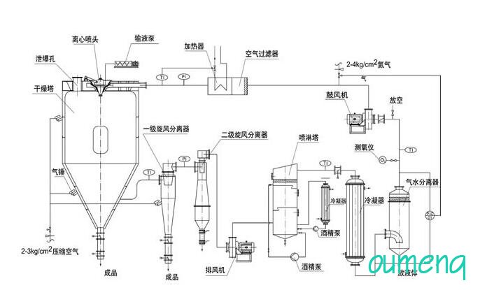 閉式循環噴霧干燥機系統由噴霧干燥機主機、帶空氣過濾器的加熱器、鼓風機、水氣分離器、大小冷卻塔、噴淋塔、排風機、一級旋風分離器、二級旋風分離器、泵、測氧儀以及管路與控制閥等組成。